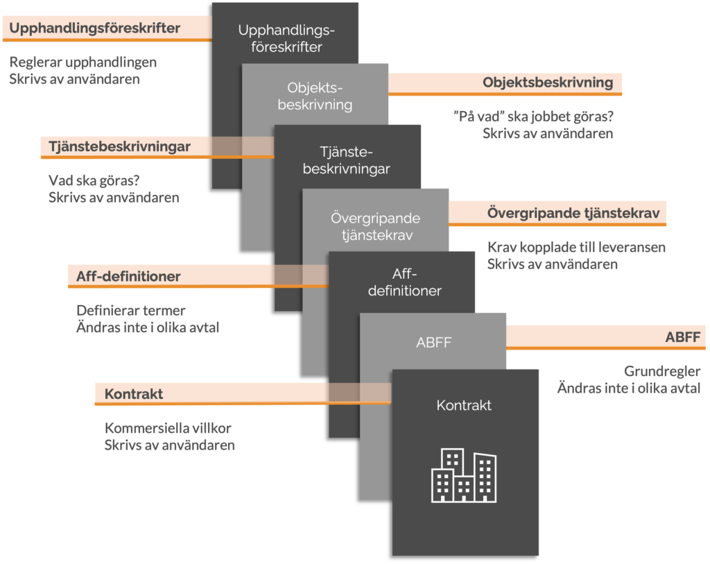 Aff innehåller fasta branschregelverk (ABFF och Aff-definitioner) och mallar som hjälper dig att göra en komplett upphandling och avtal. Dessutom finns det olika stödjande dokument. Vi brukar kalla det Aff-dokumentationen.